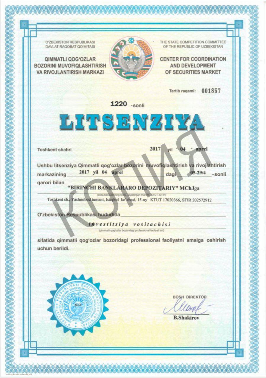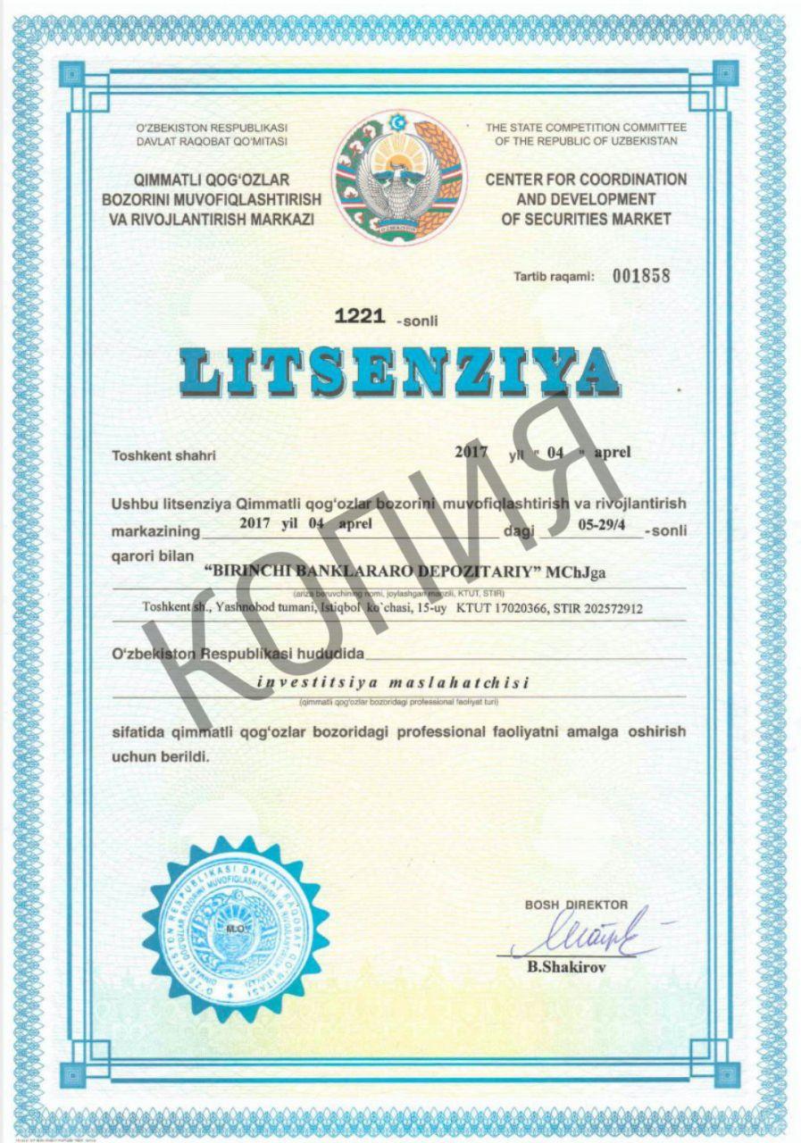 Консультант - O'zbekiston Respublikasi hududida Investitsiya maslahatchisi sifatida qimmatli qog'ozlar bozoridagi proffesional faoliyatni amalga oshirishi uchun.